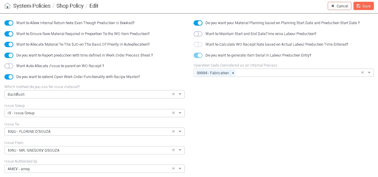 Want to Allow Internal Return Note even though Production is Booked?Select 'On' or 'Off' from the provided popup.